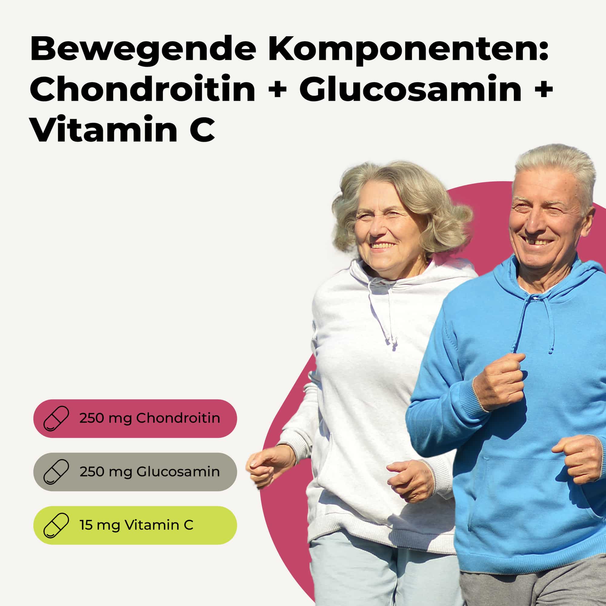 Dietary supplement with 250 mg chondroitin and 250 mg glucosamine per capsule, combined with 15 mg vitamin C (contributes to normal collagen production for normal joint-cartilage and bone function).