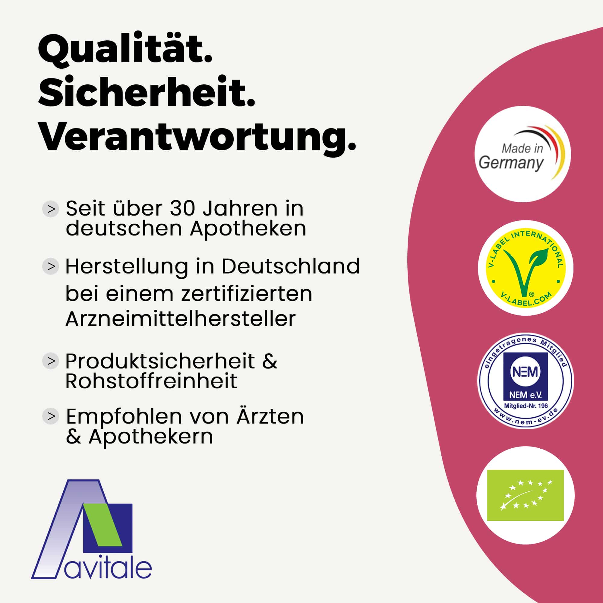 Product safety and high-quality raw materials are our top priority. We want to serve our customers as a reliable and responsible partner. Experts regularly conduct detailed studies to ensure that the excellent standard of our product range remains constant. To maintain this high, consistent standard, we – among other things – manufacture our dietary supplement with a certified pharmaceutical company in Germany.