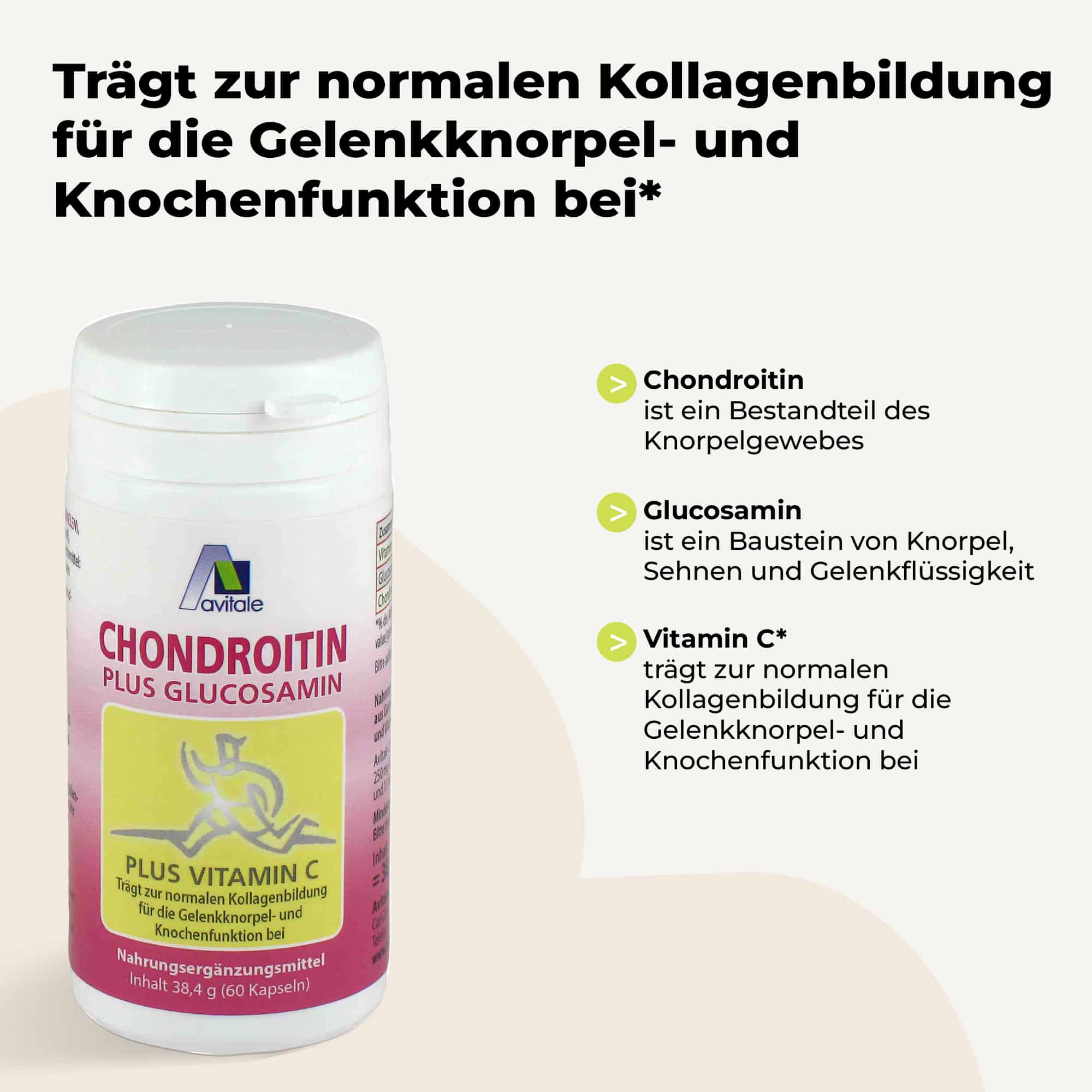 Dietary supplement with 250 mg chondroitin and 250 mg glucosamine per capsule, combined with 15 mg vitamin C (contributes to normal collagen production for normal joint-cartilage and bone function).