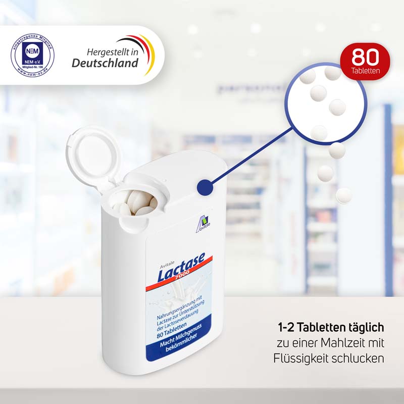 Lactase 7000 FCC Tablets introduce the enzyme lactase from the outside, thus aiding the digestion of lactose and making it easier to consume milk and dairy products. Avitale Lactase 7,000 FCC Tablets are therefore a suitable way of ensuring a good supply of calcium from consuming all kinds of dairy products.