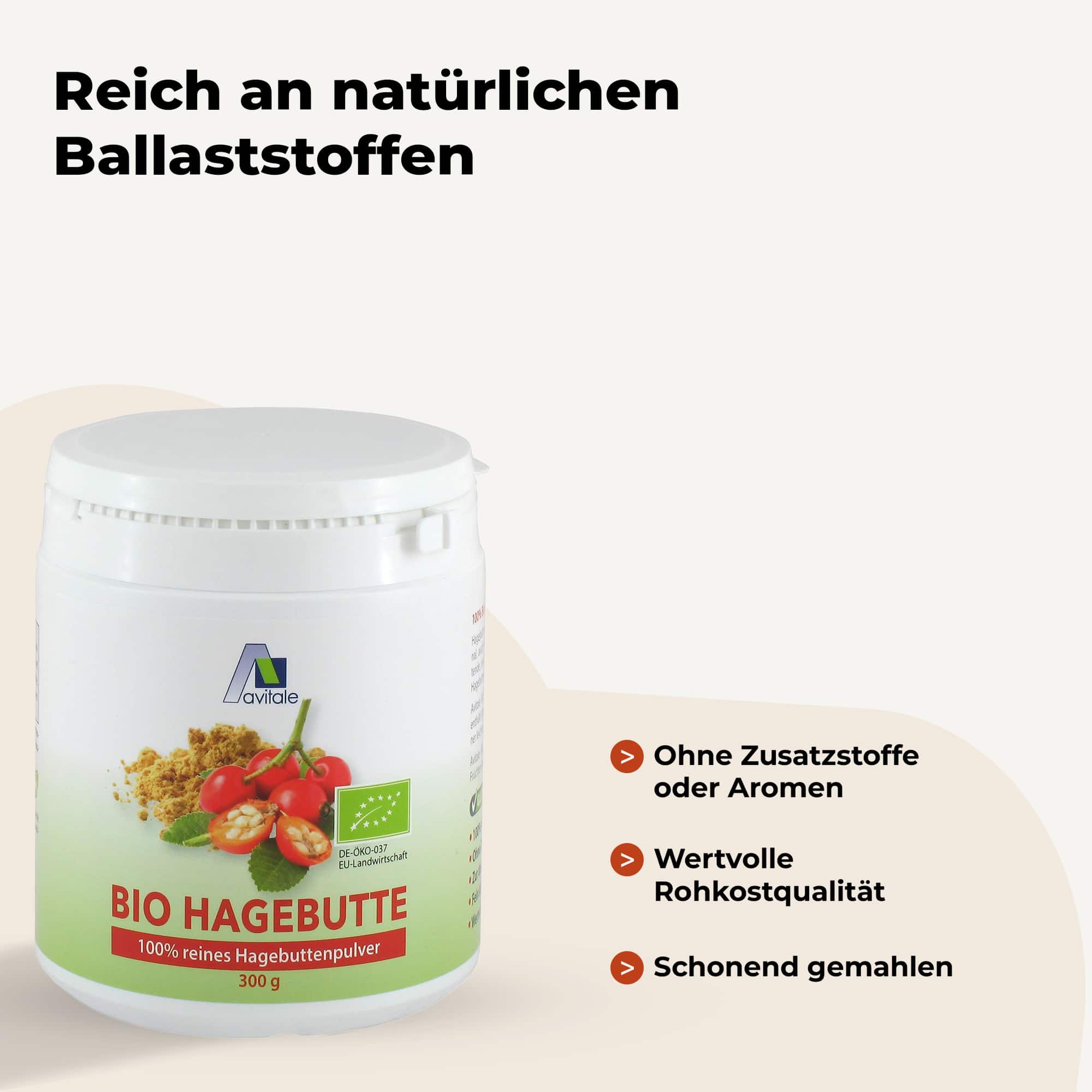 Bio Hagebuttenpulver, gemahlen aus dem Fruchtfleisch und den Kernen. Kontrolliert biologischer Anbau (DE-ÖKO-039) aus EU-Landwirtschaft. Angebaut, geerntet, getrocknet und gemahlen in Europa. Abgefüllt in Norddeutschland.