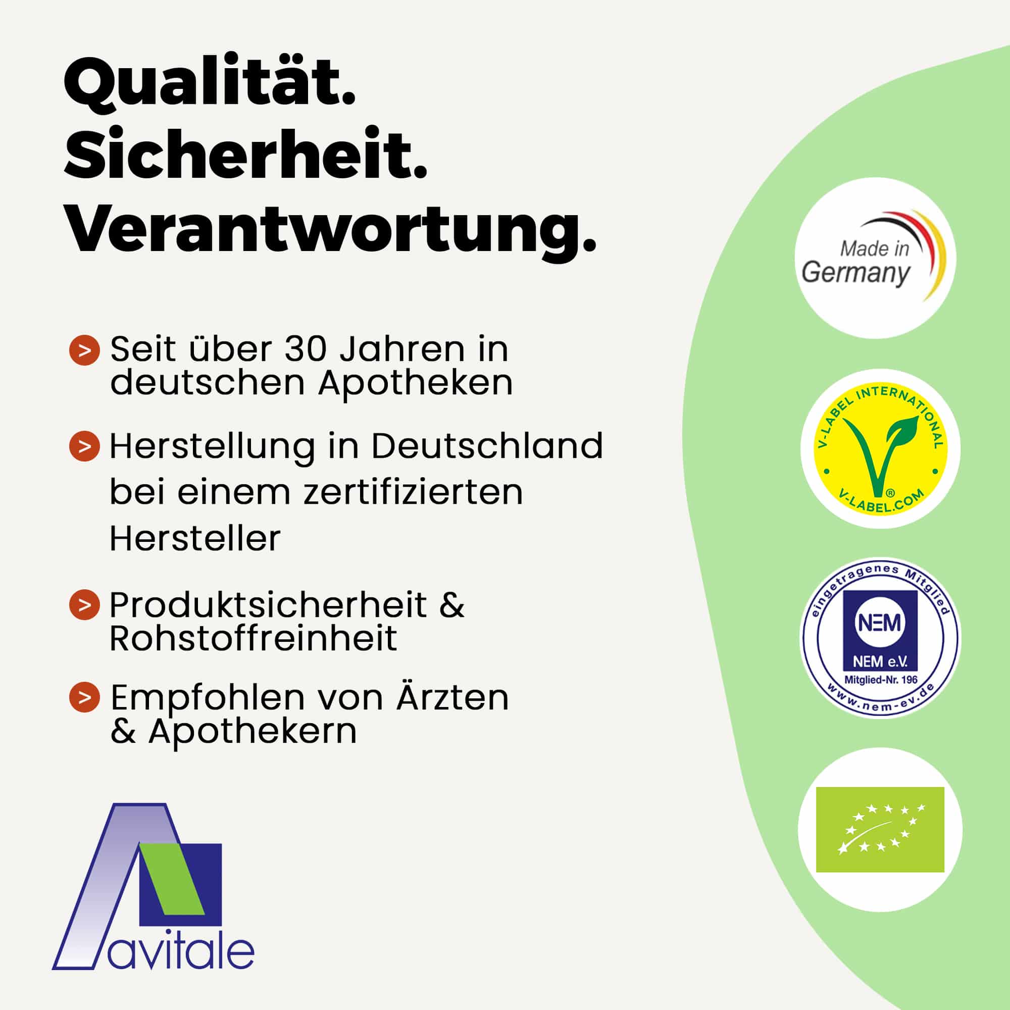 Produktsicherheit und Rohstoffqualität haben bei uns höchste Priorität. Wir wollen ein verlässlicher und verantwortungsvoller Partner für unsere Kunden sein. Regelmäßig stellen Experten durch aufwändige Untersuchungen sicher, dass das hervorragende Niveau unseres Sortiments konstant bleibt. Um diesen hohen, gleichbleibenden Standard zu erhalten, produzieren wir in Deutschland bei einem zertifizierten Arzneimittelhersteller.