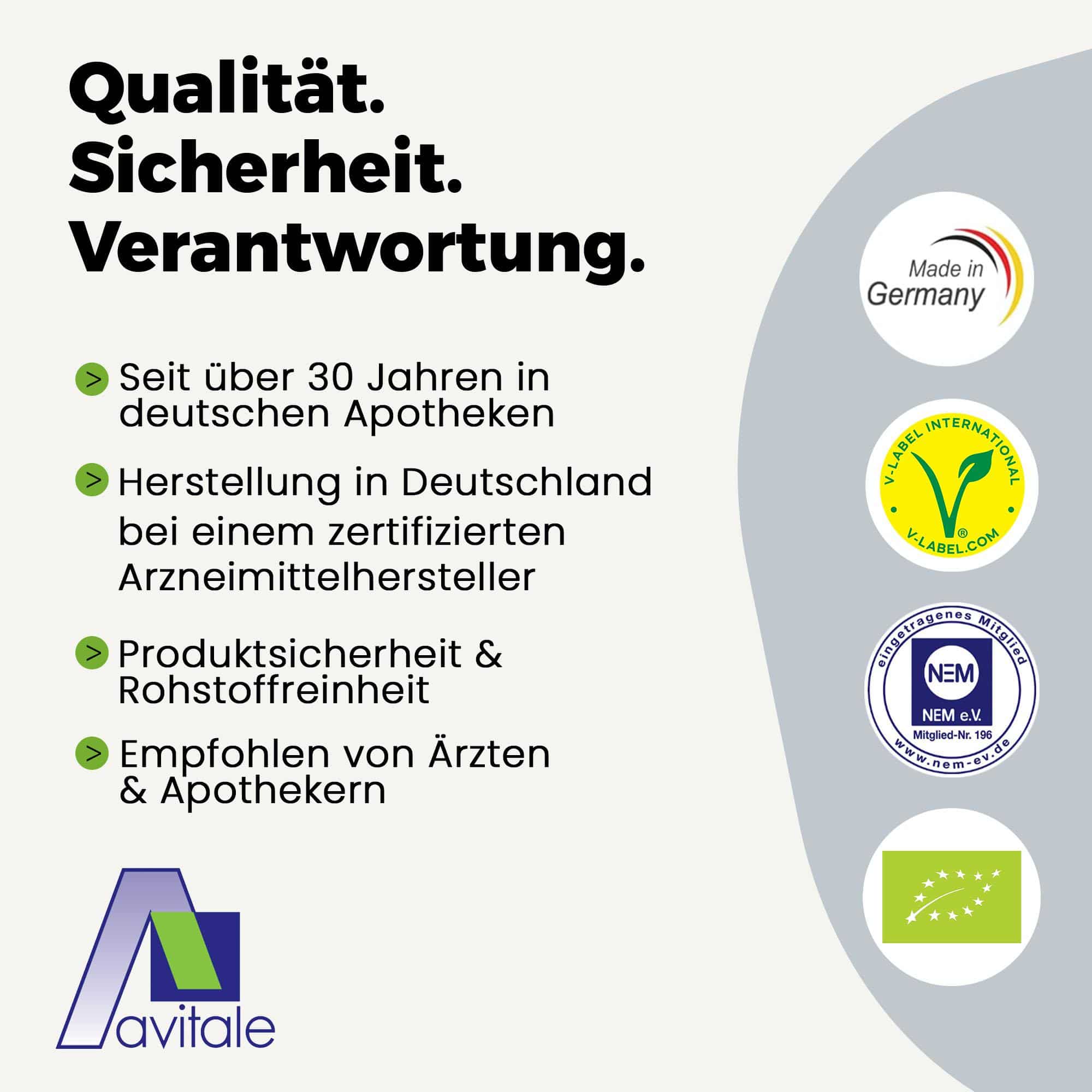 Produktsicherheit und Rohstoffqualität haben bei uns höchste Priorität. Wir wollen ein verlässlicher und verantwortungsvoller Partner für unsere Kunden sein. Regelmäßig stellen Experten durch aufwändige Untersuchungen sicher, dass das hervorragende Niveau unseres Sortiments konstant bleibt. Um diesen hohen, gleichbleibenden Standard zu erhalten, produzieren wir in Deutschland bei einem zertifizierten Arzneimittelhersteller.