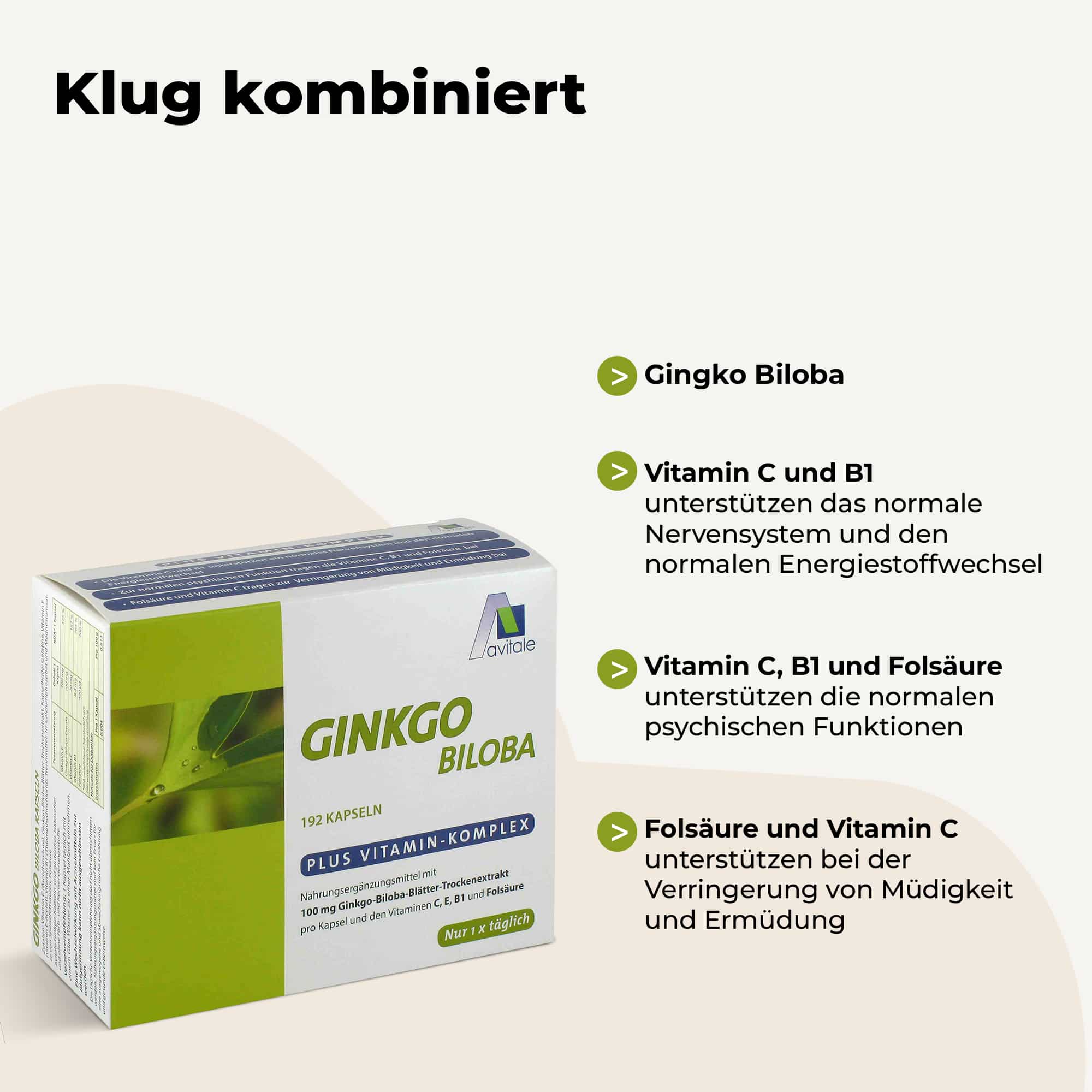 Nahrungsergänzungsmittel mit 100mg Ginkgo-Biloba-Blätter-Trockenextrakt pro Kapsel und den Vitaminen C, E, B1 und Folsäure.