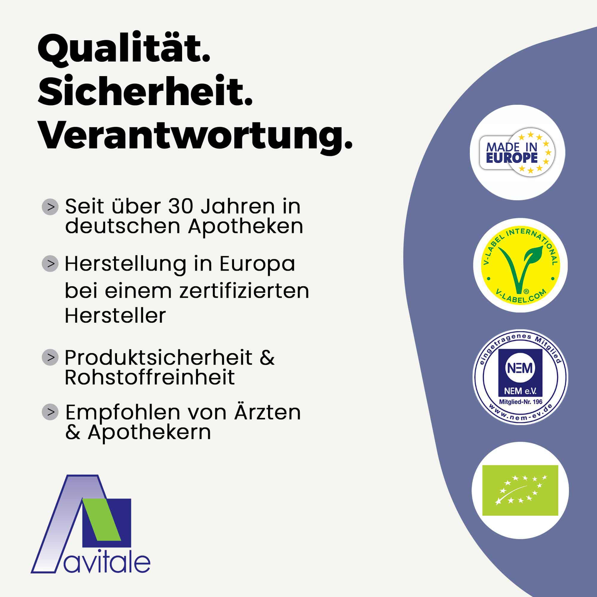 Produktsicherheit und Rohstoffqualität haben bei uns höchste Priorität. Wir wollen ein verlässlicher und verantwortungsvoller Partner für unsere Kunden sein. Regelmäßig stellen Experten durch aufwändige Untersuchungen sicher, dass das hervorragende Niveau unseres Sortiments konstant bleibt. Um diesen hohen, gleichbleibenden Standard zu erhalten, produzieren wir in Deutschland bei einem zertifizierten Arzneimittelhersteller.