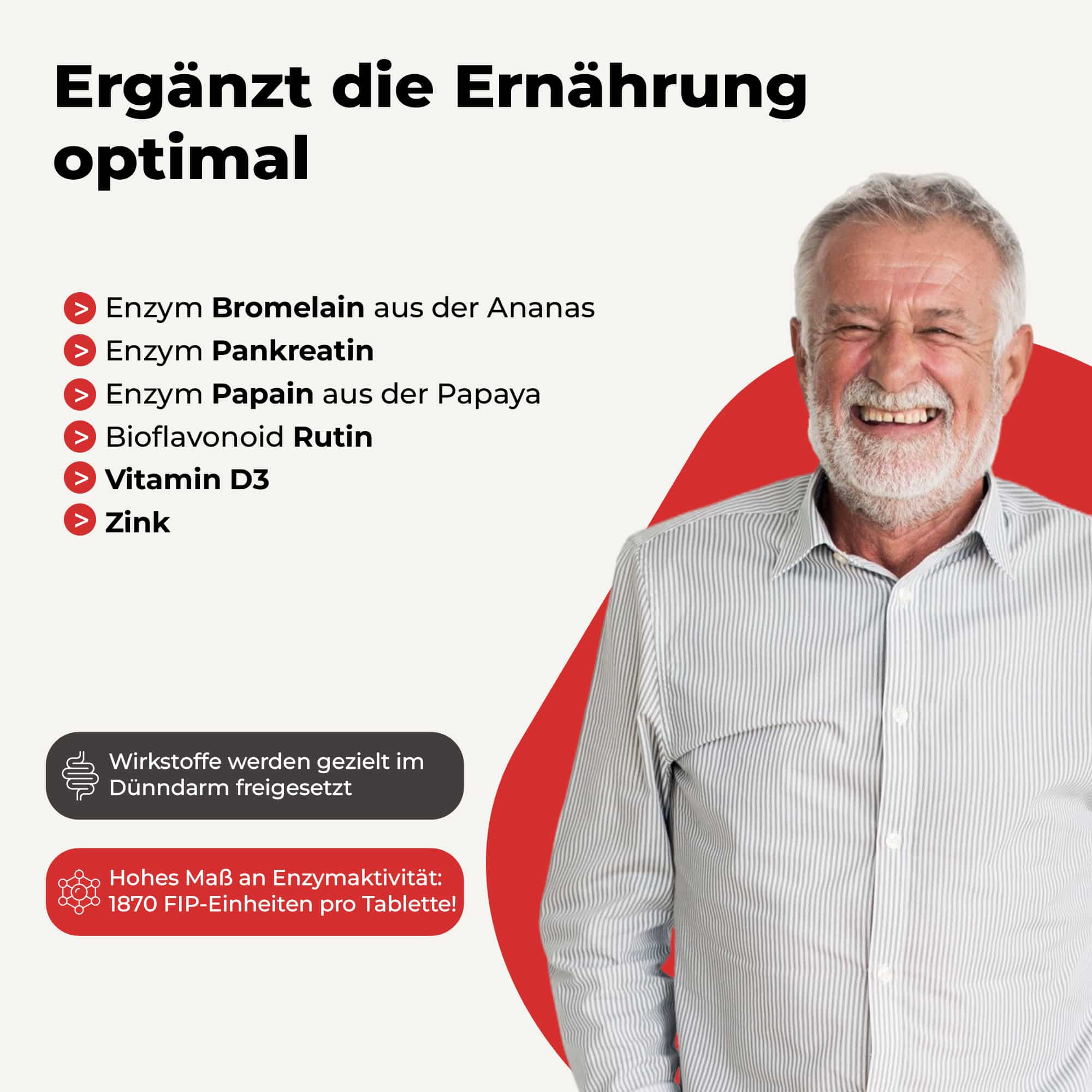 Inulin, Papain aus der Papaya (Trägerstoff: Laktose), Rutin, Bromelain aus der Ananas (Trägerstoff: Maltodextrin), Überzugsmittel: Schellack, Ammoniumhydrogencarbonat, Carboxymethylcellulose Natrium, Talkum, pflanzliches Öl (Kokosnuss), Glycerin; Pankreatin, Trennmittel: Tri-Calciumphosphat und Calciumsalze der Speisefettsäuren (pflanzlich); Zinkcitrat, Cholecalciferol