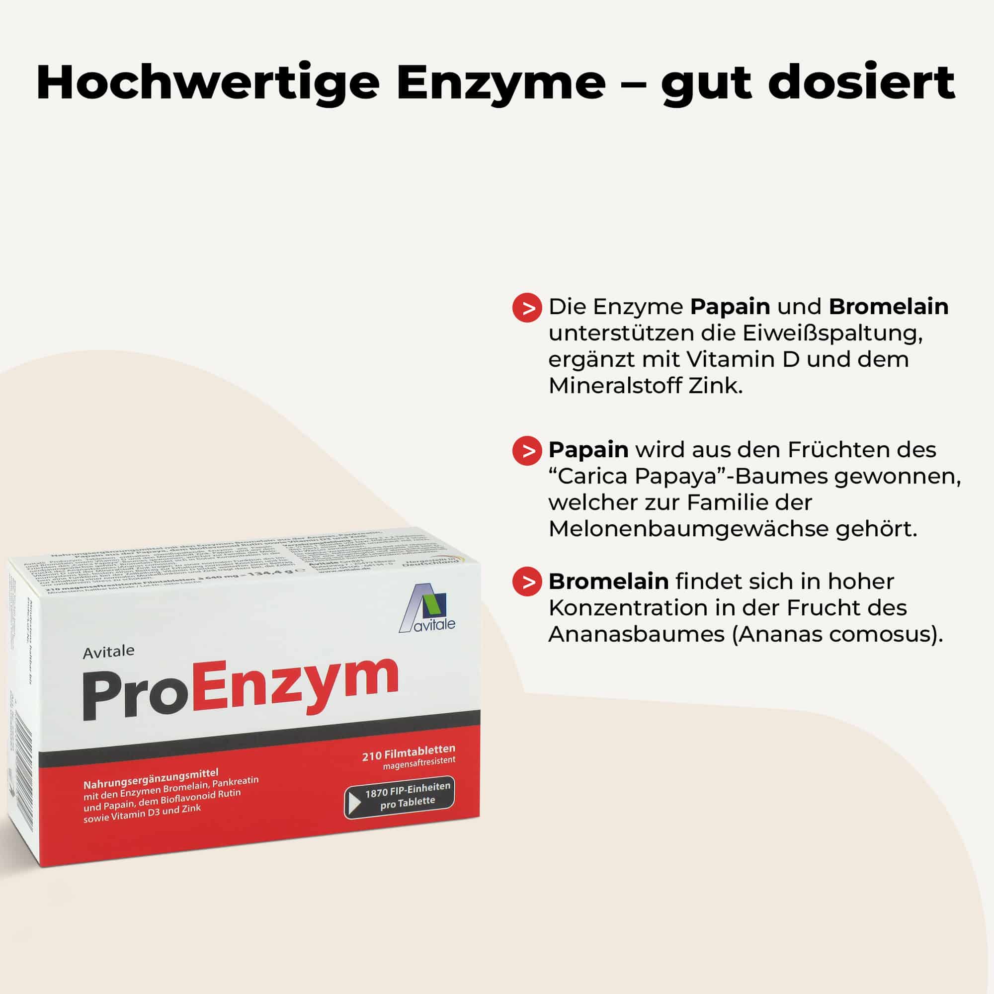 Nahrungsergänzungsmittel mit den Enzymen Bromelain aus der Ananas, Pankreatin, Papain aus der Papaya, dem Bioflavonoid Rutin sowie Vitamin D3 und Zink.