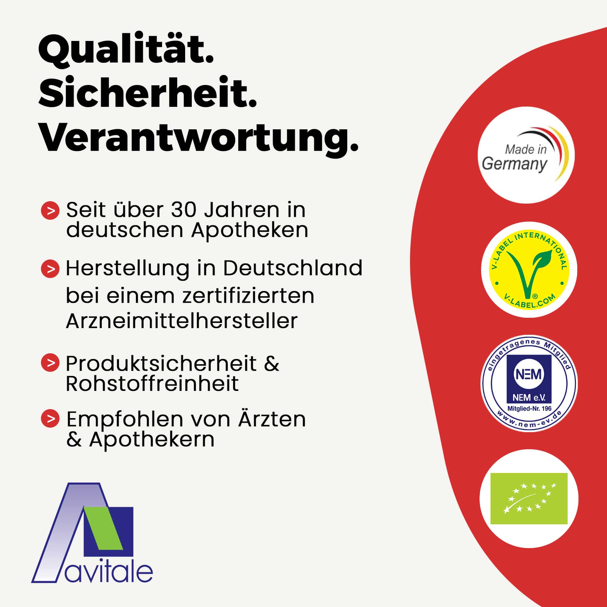 Produktsicherheit und Rohstoffqualität haben bei uns höchste Priorität. Wir wollen ein verlässlicher und verantwortungsvoller Partner für unsere Kunden sein. Regelmäßig stellen Experten durch aufwändige Untersuchungen sicher, dass das hervorragende Niveau unseres Sortiments konstant bleibt. Um diesen hohen, gleichbleibenden Standard zu erhalten, produzieren wir in Deutschland bei einem zertifizierten Arzneimittelhersteller.